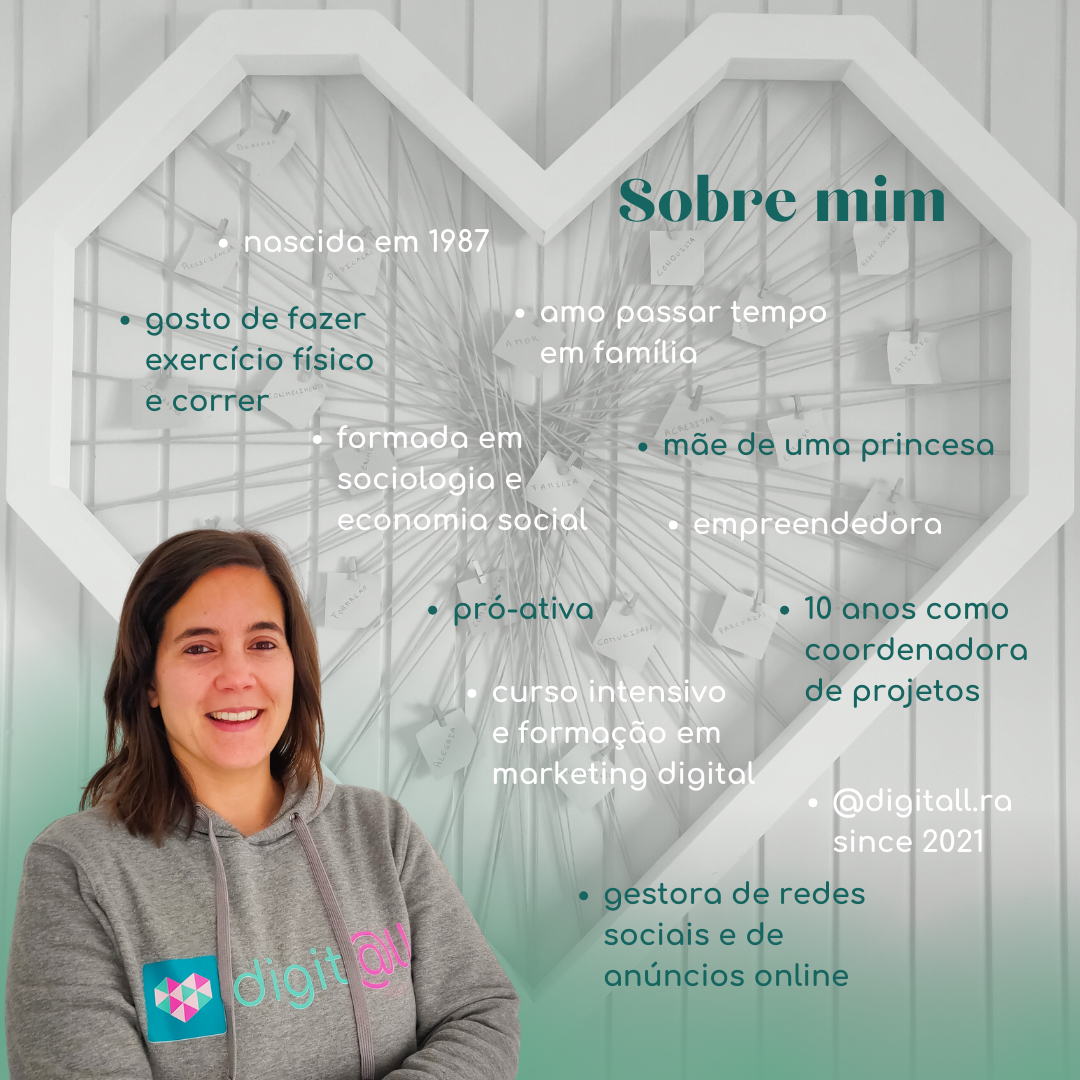 Formei-me em Sociologia e mais tarde em Economia Social (áreas que adoro); sempre gostei de ajudar os outros e sentir-me envolvida em projetos desafiantes. Apaixonei-me pela área do Marketing Digital e voltei aos estudos.